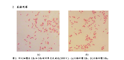 2、 將實驗菌株細菌在NA斜面置于37℃培養,斜面生長至12h時,取菌進行革蘭氏染色,油鏡鏡檢。斜面繼續培養至16h時,同樣,取菌鏡檢。
