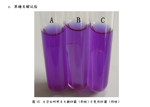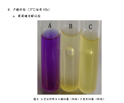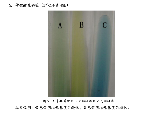 3、 將產(chǎn)氣腸桿菌接種到生理生化檢測培養(yǎng)基中,37℃培養(yǎng)48h。檢測菌種生理生化特性。