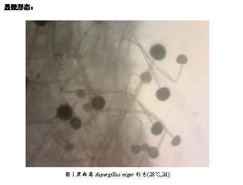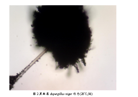 黑曲霉采用玻璃紙法在PDA培養(yǎng)基上接種,28℃培養(yǎng)。第2天即可看到黑曲霉產(chǎn)孢,但產(chǎn)孢較少,第3天可可明顯觀察到產(chǎn)孢量增多。黑曲霉菌絲有隔膜,為多細(xì)胞霉菌。菌絲體產(chǎn)生大量的分生孢子梗,分生孢子梗頂端膨大成為頂囊,一般呈球形。頂囊表面長滿一層或兩層輻射狀小梗(初生小梗與次生小梗)。最上層小梗瓶狀,頂端著生成串的球形分生孢子。孢子呈黑色。分生孢子梗生于足細(xì)胞上,并通過足細(xì)胞與營養(yǎng)菌絲相連。培養(yǎng)一周后,可看到明顯的孢子脫落。連續(xù)觀察2周,仍然可以觀察到黑曲霉的產(chǎn)孢結(jié)構(gòu),分生孢子易觀察。